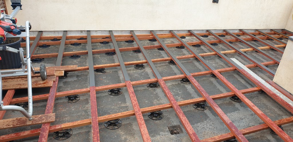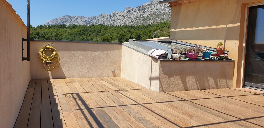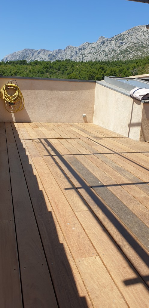 Double structure de lambourdes en Padouk sur plots PVC, platelage en IPE de 25 m2